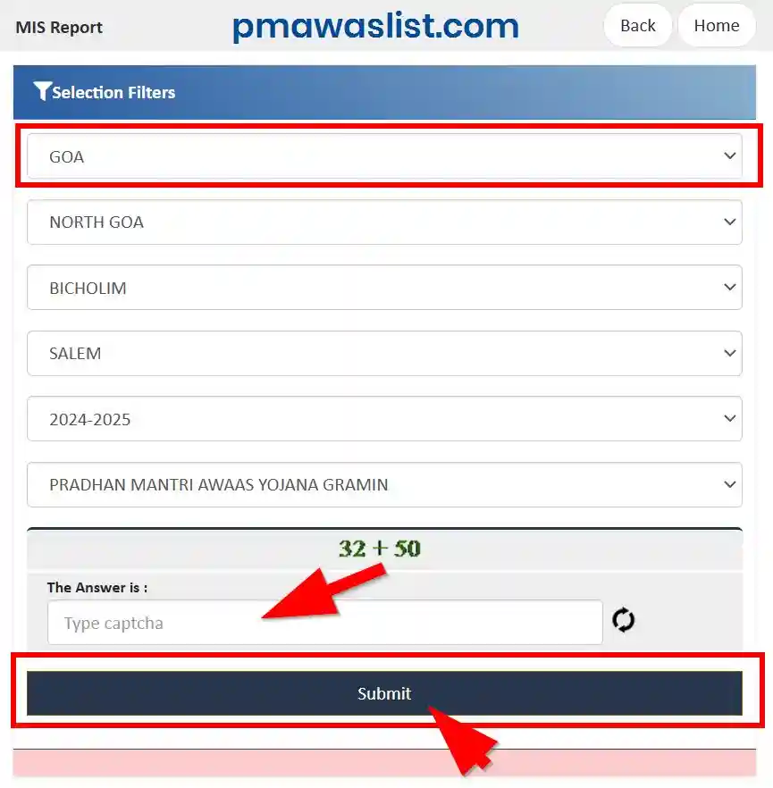 स्टेप 5. इसके बाद निचे “Captcha code” लिखे और “Submit” बटन पर क्लिक करें। इसके साथ ही आपके सामने आपका राज्य गोवा प्रधानमंत्री आवास योजना ग्रामीण लिस्ट खुल जायेगा। इस लिस्ट में आप अपना नाम देख सकते है साथ ही इसे PDF फाइल में डाउनलोड कर सकते है व प्रिंट कर सकते है।